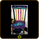 Chairs like tables are another three dimensional object that when covered with colorful patterns, eclectic images, and whimsy make a fine piece of art. Take mine for instance!